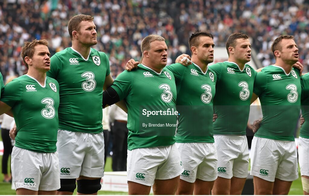 5 September 2015; Ireland players, from left, Eoin Reddan, Donnacha Ryan, Nathan White, Conor Murray, Robbie Henshaw and Tommy Bowe stand for the national anthem before the game. Rugby World Cup Warm-Up Match, England v Ireland. Twickenham Stadium, London, England. Picture credit: Brendan Moran / SPORTSFILE