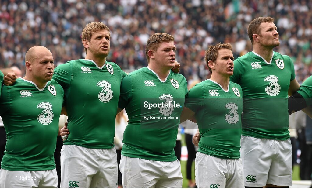 5 September 2015; Ireland players, from left, Richardt Strauss, Chris Henry, Tadhg Furlong, Eoin Reddan and Donnacha Ryan stand for the national anthem before the game. Rugby World Cup Warm-Up Match, England v Ireland. Twickenham Stadium, London, England. Picture credit: Brendan Moran / SPORTSFILE