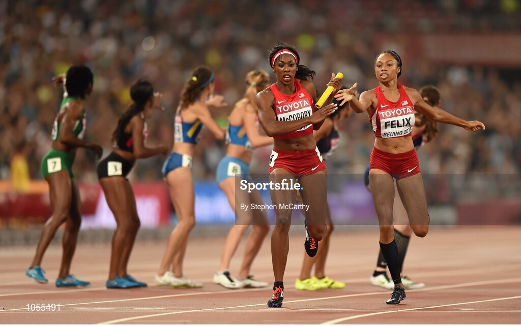 30 August 2015; Francena McCorory receieves the baton from her USA team-mate Allyson Felix during the Women's 4x400m Relay final. IAAF World Athletics Championships Beijing 2015 - Day 9, National Stadium, Beijing, China. Picture credit: Stephen McCarthy / SPORTSFILE
