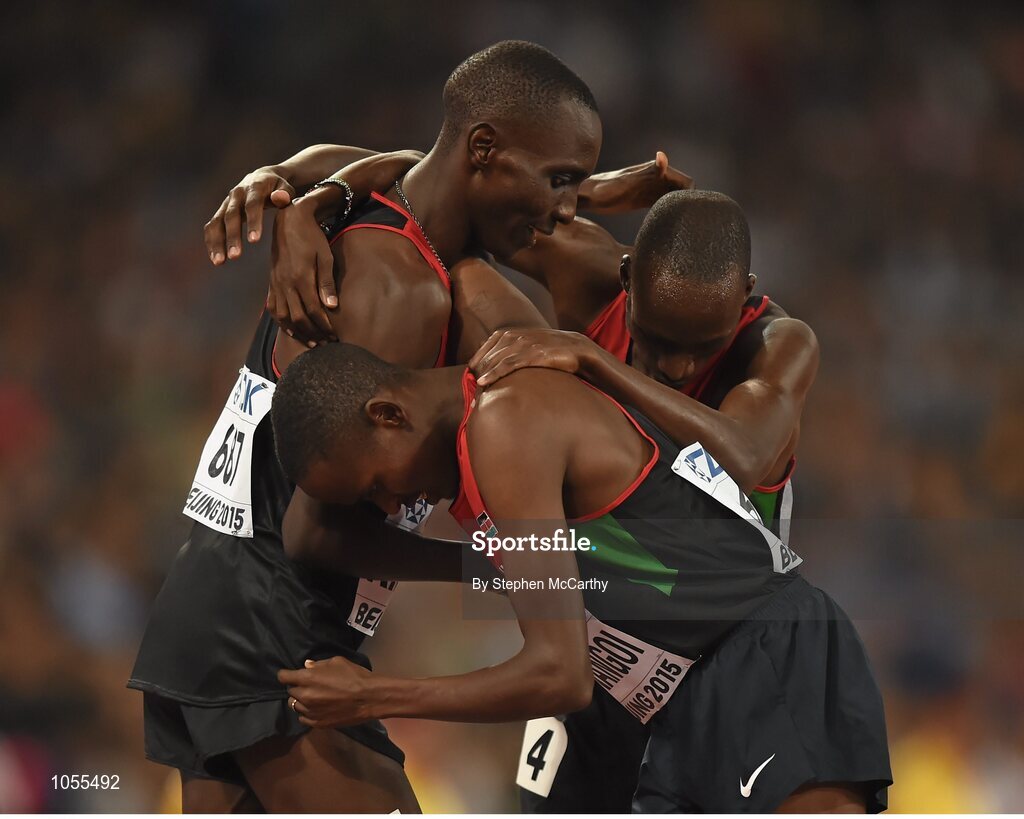 30 August 2015; Gold medalist Asbel Kiprop of Kenya, silver medalist Elijah Motonei Manangoi of Kenya and Timothy Cheruiyot of Kenya following the Men's 1500m final. IAAF World Athletics Championships Beijing 2015 - Day 9, National Stadium, Beijing, China. Picture credit: Stephen McCarthy / SPORTSFILE