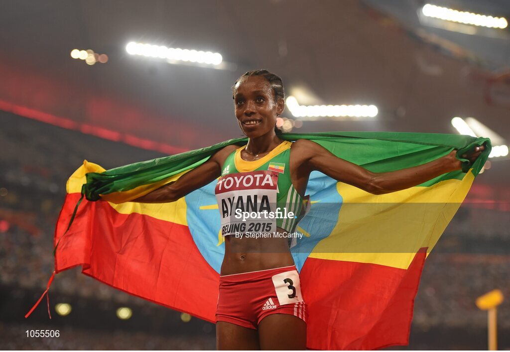 30 August 2015; Almaz Ayana of Ethiopia after winning the Women's 5000m final. IAAF World Athletics Championships Beijing 2015 - Day 9, National Stadium, Beijing, China. Picture credit: Stephen McCarthy / SPORTSFILE
