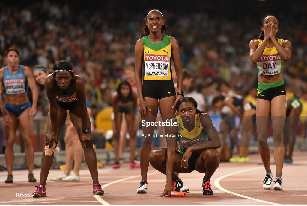 30 August 2015; Gold medalists, from left, Shericka Jackson of Jamaica, Stephenie Ann McPherson of Jamaica, Novlene Williams-Mills of Jamaica and Christine Day of Jamaica look to the scoreboard following the Women's 4x400m Relay Final. IAAF World Athletics Championships Beijing 2015 - Day 9, National Stadium, Beijing, China. Picture credit: Stephen McCarthy / SPORTSFILE