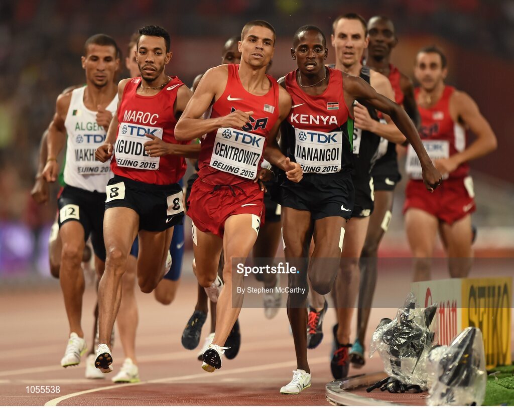 30 August 2015; Athletes, from left, Abdalaati Iguider of Morocco, Matthew Centrowitz of USA and Elijah Motonei Manangoi of Kenya during the final of the Men's 1500m event. IAAF World Athletics Championships Beijing 2015 - Day 9, National Stadium, Beijing, China. Picture credit: Stephen McCarthy / SPORTSFILE