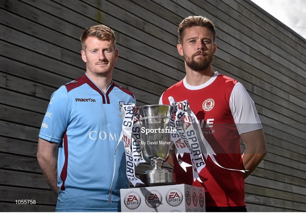 15 September 2015; Paul Sinnott, Galway United, and Ger O'Brien, St.Patrick's Athletic, during the EA Sports Cup Final Media Day. FAI National Training Centre, Abbotstown, Co. Dublin. Picture credit: David Maher / SPORTSFILE