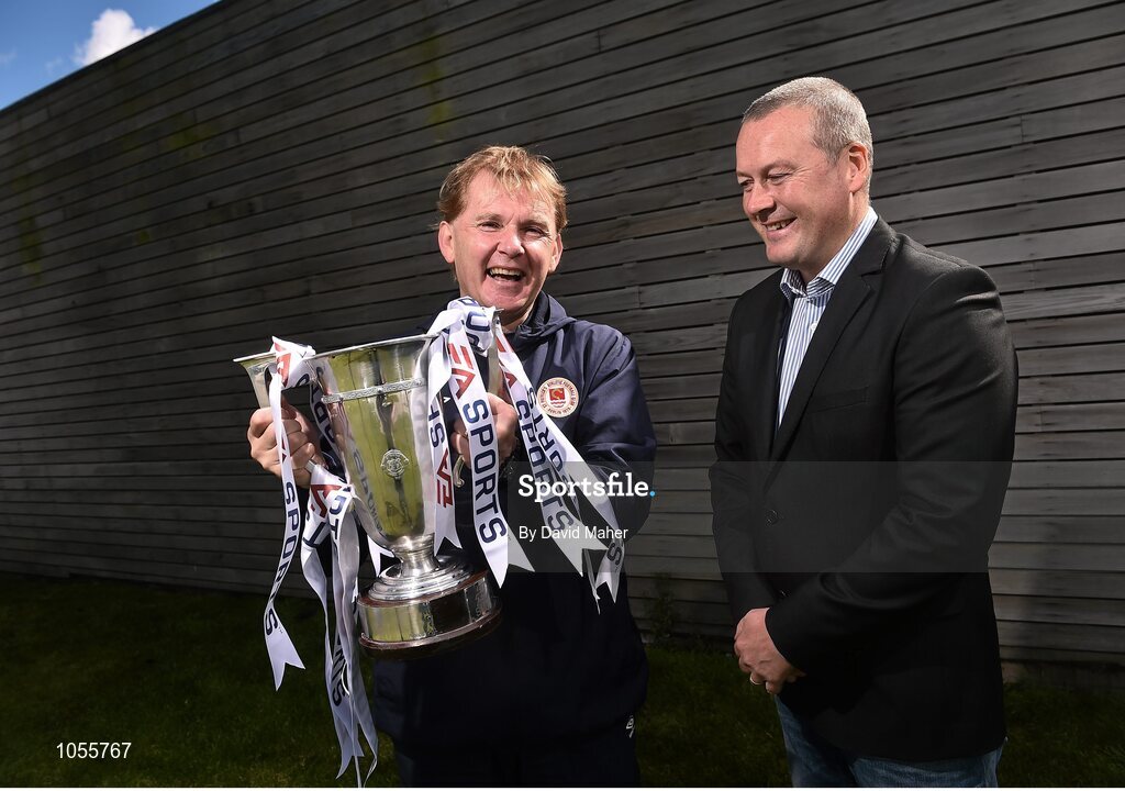 15 September 2015; Liam Buckley, left, St.Patrick's Athletic manager with Galway United manager Tommy Dunne, during the EA Sports Cup Final Media Day. FAI National Training Centre, Abbotstown, Co. Dublin. Picture credit: David Maher / SPORTSFILE