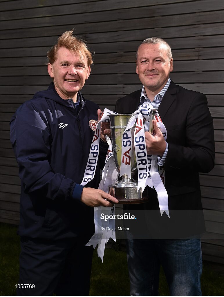 15 September 2015; Liam Buckley, left, St.Patrick's Athletic manager with Galway United manager Tommy Dunne, during the EA Sports Cup Final Media Day. FAI National Training Centre, Abbotstown, Co. Dublin. Picture credit: David Maher / SPORTSFILE