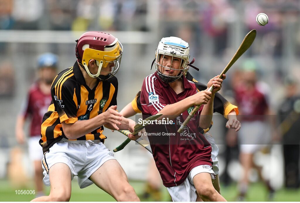 6 September 2015; Padraig Hynes, Knockanore, Co. Waterford, representing Galway, in action against Murrough McMahon, Crusheen NS, Co. Clare, representing Kilkenny, during the Cumann na mBunscoil INTO Respect Exhibition Go Games 2015 at Kilkenny v Galway - GAA Hurling All-Ireland Senior Championship Final. Croke Park, Dublin Picture credit: Diarmuid Greene / SPORTSFILE