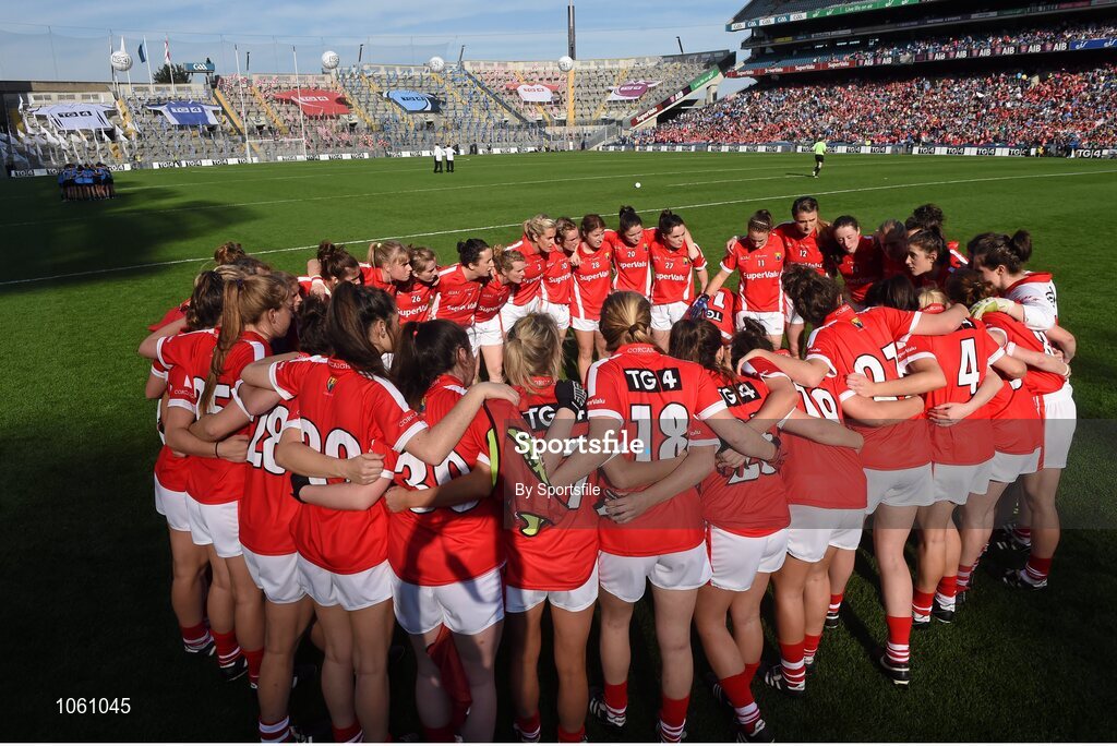 27 September 2015; The Cork players in a huddle before the start of the game. TG4 Ladies Football All-Ireland Senior Championship Final, Croke Park, Dublin. Photo by Sportsfile