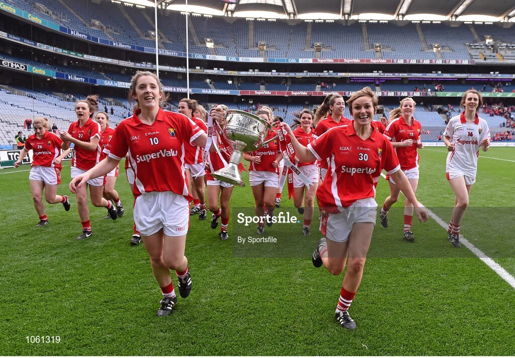 27 September 2015; Cork captain Ciara O'Sullivan, left, and team-mate Áine Hayes celebrate with the Brendan Martin Cup after the game. TG4 Ladies Football All-Ireland Senior Championship Final, Croke Park, Dublin. Photo by Sportsfile