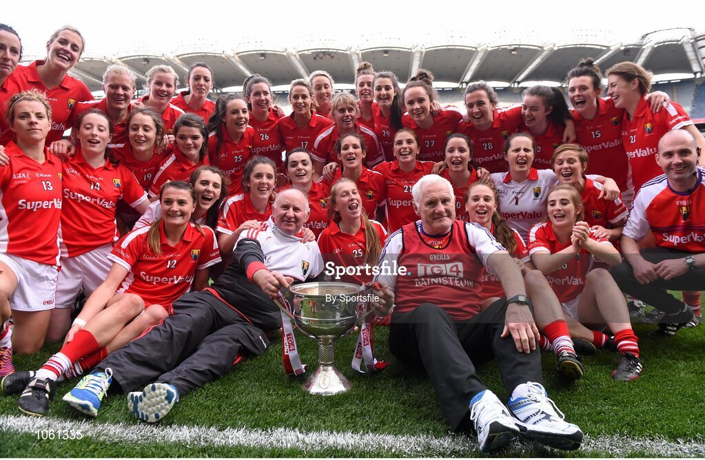 27 September 2015; The Cork team together with manager Eamonn Ryan and selector Frankie Honohan, left, celebrate with the Brendan Martin Cup after the game TG4 Ladies Football All-Ireland Senior Championship Final, Croke Park, Dublin. Photo by Sportsfile