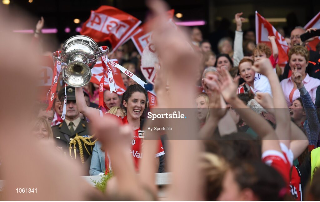 27 September 2015; Cork captain Ciara O'Sullivan lifts the Brendan Martin Cup. TG4 Ladies Football All-Ireland Senior Championship Final, Croke Park, Dublin. Photo by Sportsfile