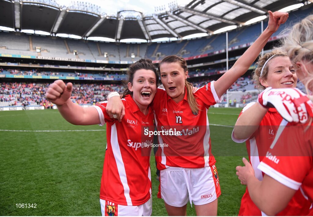 27 September 2015; Doireann O'Sullivan, left, and Annie Walsh, Cork, celebrate after the game. TG4 Ladies Football All-Ireland Senior Championship Final, Croke Park, Dublin. Photo by Sportsfile