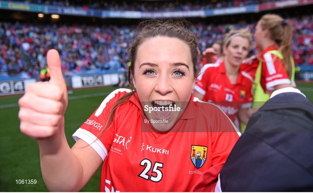 27 September 2015; Orlagh Farmer, Cork, celebrates after the game. TG4 Ladies Football All-Ireland Senior Championship Final, Croke Park, Dublin. Photo by Sportsfile