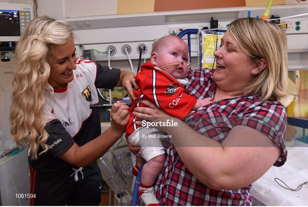 28 September 2015; 10 month old Daniel Sheehan, from Larchfiels, Cork City, with his mother Michelle and Cork ladies footballer Brid Stack during a visit by the TG4 Ladies Football All-Ireland Senior Champions to Crumlin Children's Hospital, Crumlin, Dublin. Picture credit: Matt Browne / SPORTSFILE