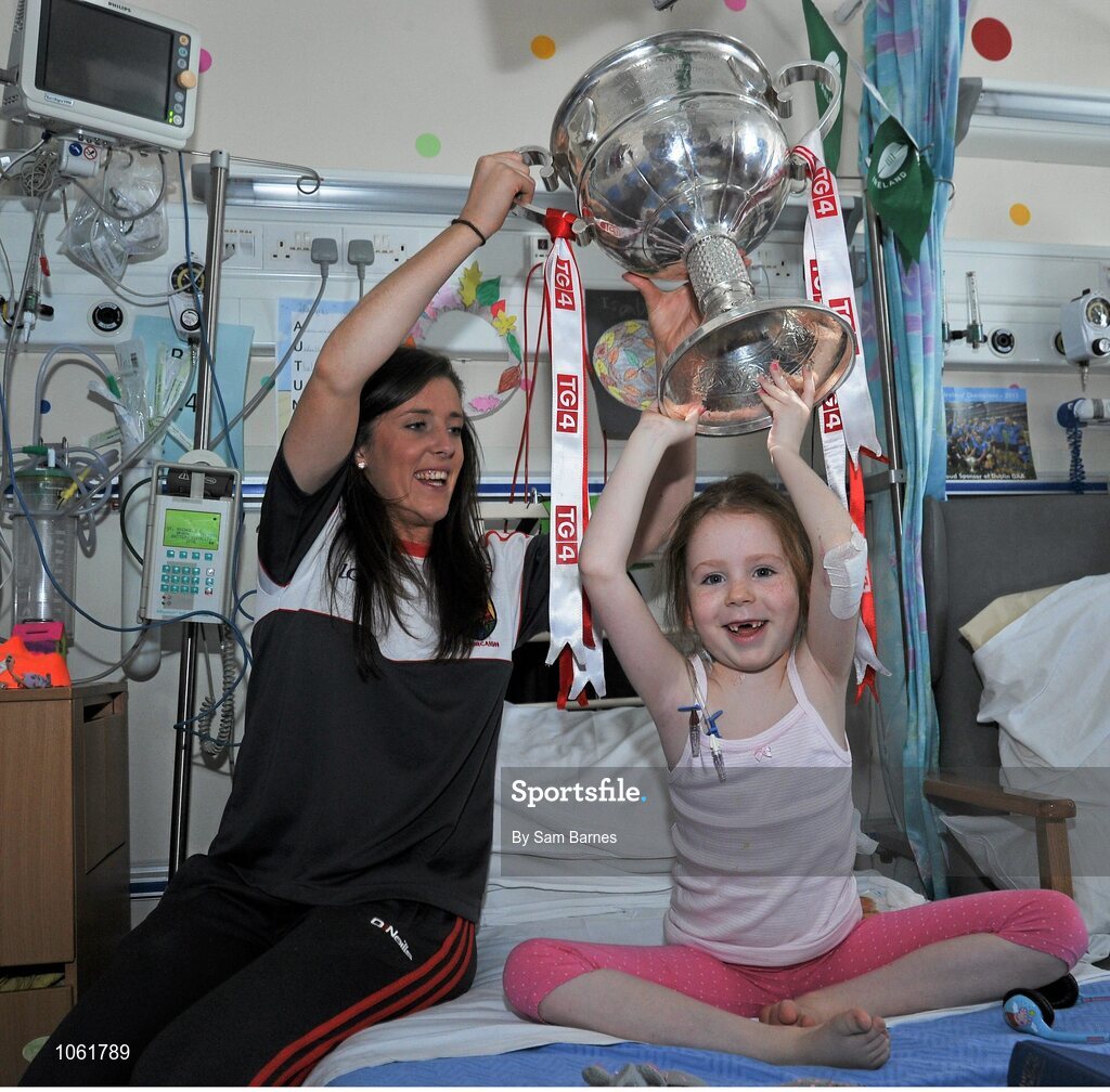28 September 2015; Isabel O'Dwyer, from Dublin, with Cork ladies footballer Ciara O'Sullivan during a visit by the TG4 Ladies Football All-Ireland Senior Champions to Temple Street Hospital, Temple Street, Dublin. Picture credit: Sam Barnes / SPORTSFILE