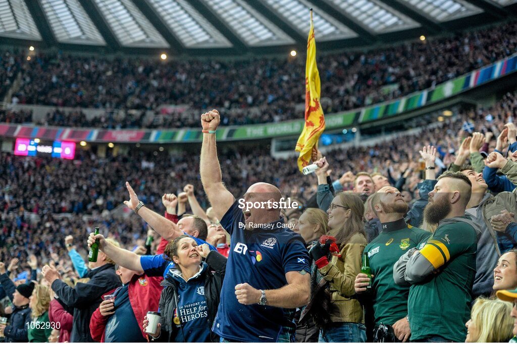 3 October 2015; Scotland supporters celebrate their side's first try of the game. 2015 Rugby World Cup, Pool B, South Africa v Scotland, St James' Park, Newcastle, England. Picture credit: Ramsey Cardy / SPORTSFILE