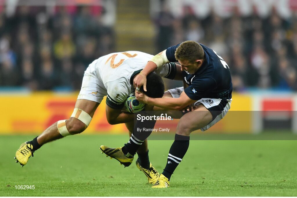 3 October 2015; Damian de Allende, South Africa, is tackled by Duncan Weir, Scotland. 2015 Rugby World Cup, Pool B, South Africa v Scotland, St James' Park, Newcastle, England. Picture credit: Ramsey Cardy / SPORTSFILE