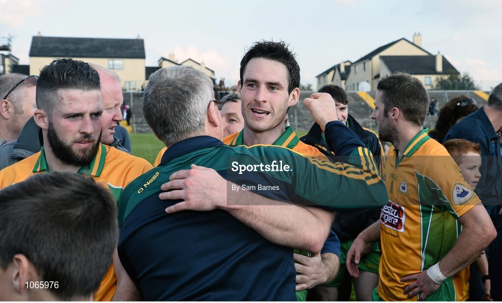 11 October 2015; Michael Farragher, Corofin, celebrates with friends and family at the final whistle. Galway County Senior Football Championship Final, Mountbellew/Moylough v Corofin. Tuam Stadium, Tuam, Co. Galway. Picture credit: Sam Barnes / SPORTSFILE