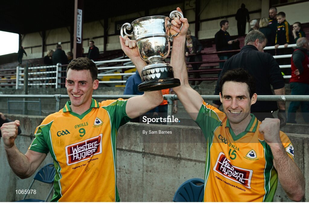 11 October 2015; Ronan Steede, left, and Michael Farragher, Corofin, celebrate with the cup. Galway County Senior Football Championship Final, Mountbellew/Moylough v Corofin. Tuam Stadium, Tuam, Co. Galway. Picture credit: Sam Barnes / SPORTSFILE