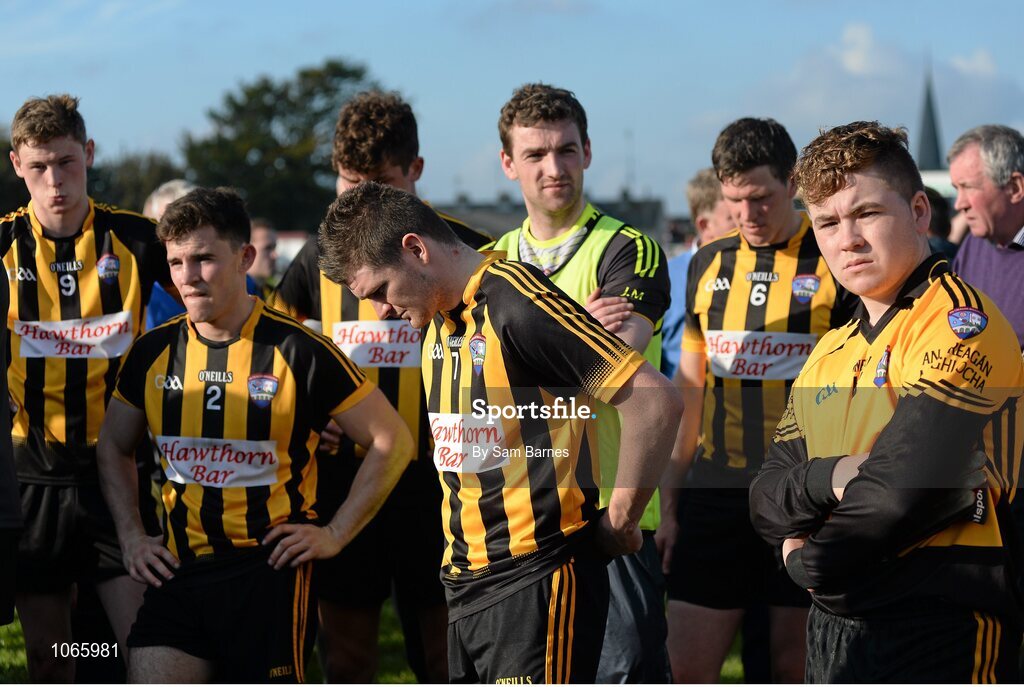 11 October 2015; Mountbellew/Moylough players dejected at the final whistle. Galway County Senior Football Championship Final, Mountbellew/Moylough v Corofin. Tuam Stadium, Tuam, Co. Galway. Picture credit: Sam Barnes / SPORTSFILE