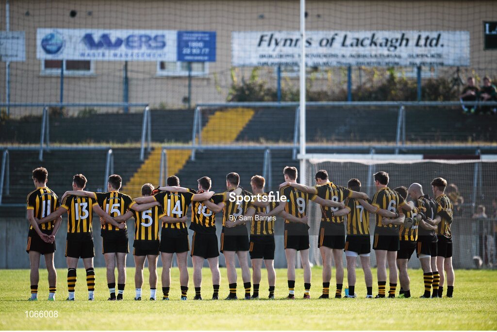 11 October 2015; The Mountbellew/Moylough team face the Tricolour during the National Anthem. Galway County Senior Football Championship Final, Mountbellew/Moylough v Corofin. Tuam Stadium, Tuam, Co. Galway. Picture credit: Sam Barnes / SPORTSFILE