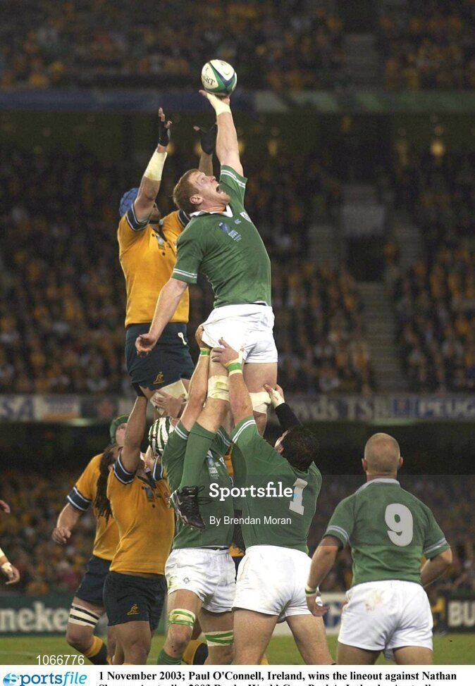 1 November 2003; Paul O'Connell, Ireland, wins the lineout against Nathan Sharpe, Australia. 2003 Rugby World Cup, Pool A, Ireland v Australia, Telstra Dome, Melbourne, Victoria, Australia. Picture credit; Brendan Moran / SPORTSFILE *EDI*