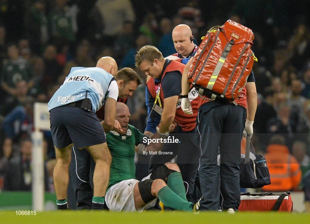 11 October 2015; Paul O'Connell, Ireland, sits back down on the pitch helped by Dr Eanna Falvey before being stretchered from the pitch after picking up an injury. 2015 Rugby World Cup Pool D, Ireland v France. Millennium Stadium, Cardiff, Wales. Picture credit: Matt Browne / SPORTSFILE