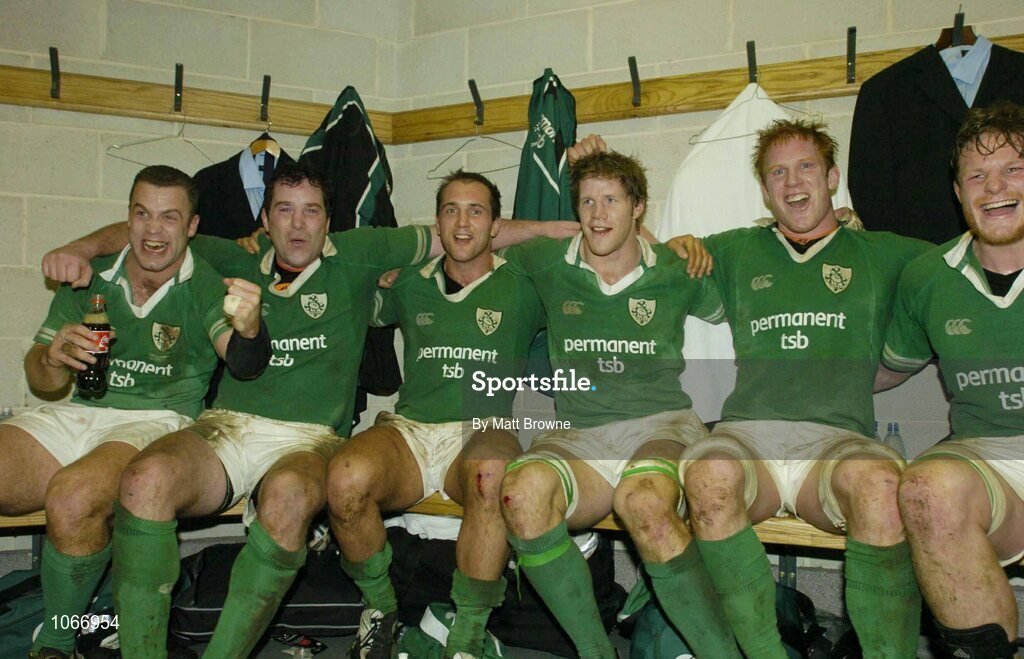 6 March 2004; Irish players, l to r, Kevin Maggs, Anthony Foley, Keith Gleeson, Simon Easterby, Paul O'Connell and Malcolm O'Kelly celebrate in the dressing room after victory over England. RBS 6 Nations Championship 2003-2004, England v Ireland, Twickenham, England. Picture credit; Matt Browne / SPORTSFILE *EDI*