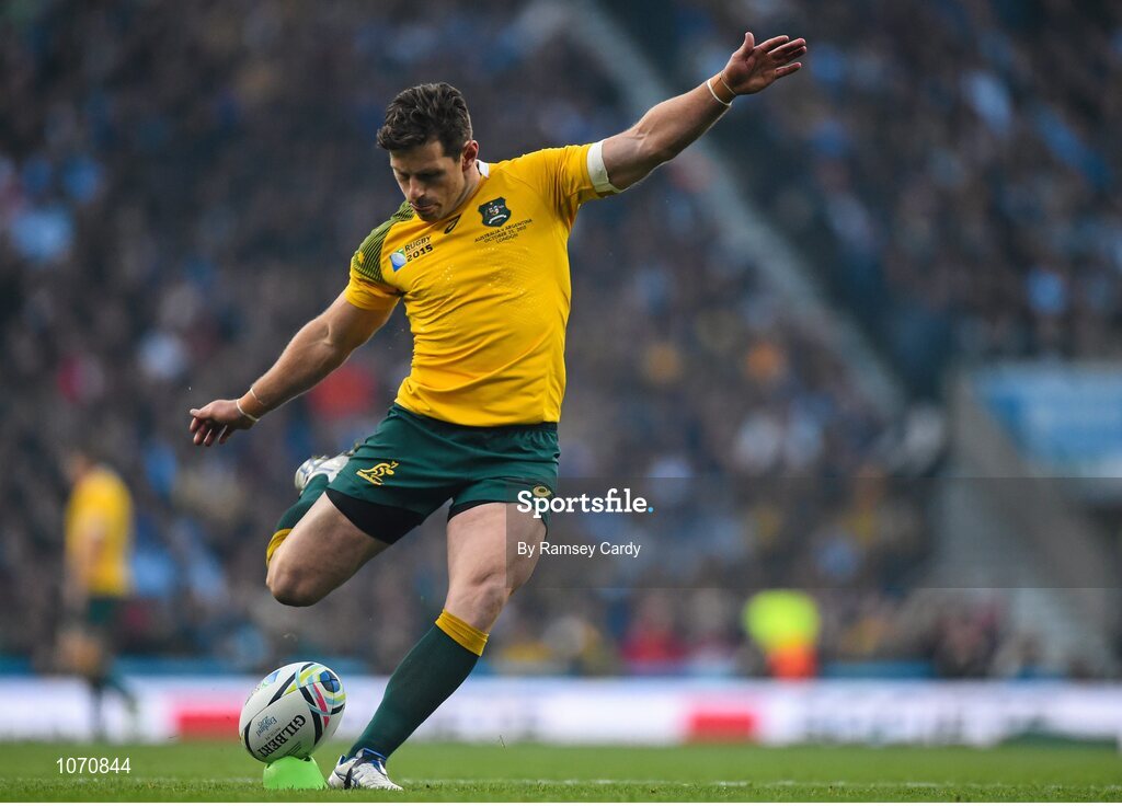 25 October 2015; Bernard Foley, Australia, kicks a conversion. 2015 Rugby World Cup, Semi-Final, Argentina v Australia. Twickenham Stadium, Twickenham, London, England. Picture credit: Ramsey Cardy / SPORTSFILE