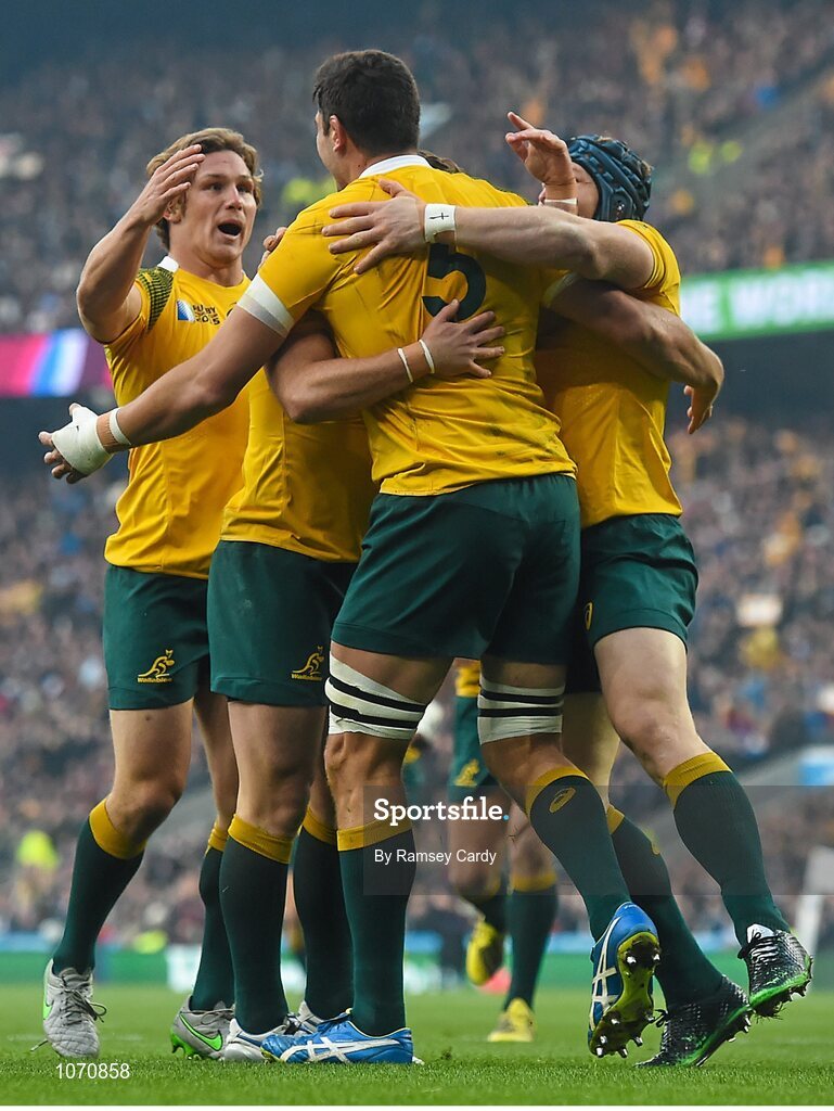 25 October 2015; Rob Simmons, Australia, is congratulated by team-mates after scoring his side's first try of the game. 2015 Rugby World Cup, Semi-Final, Argentina v Australia. Twickenham Stadium, Twickenham, London, England. Picture credit: Ramsey Cardy / SPORTSFILE