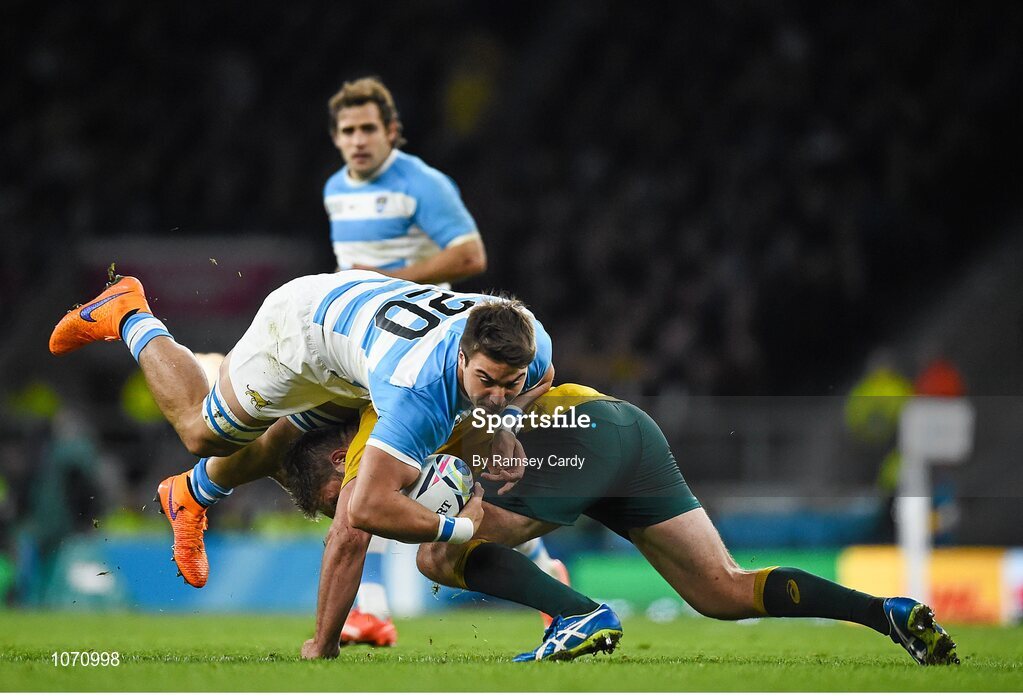 25 October 2015; Facundo Isa, Argentina, is tackled by Rob Simmons, Australia. 2015 Rugby World Cup, Semi-Final, Argentina v Australia. Twickenham Stadium, Twickenham, London, England. Picture credit: Ramsey Cardy / SPORTSFILE