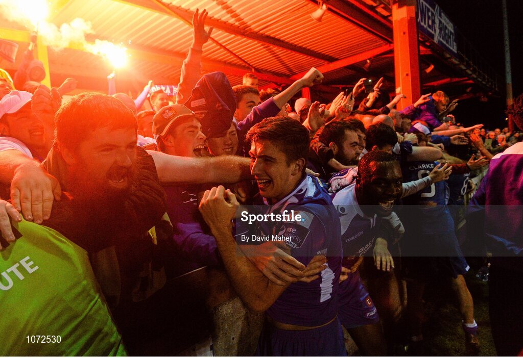 30 October 2015; Limerick FC players celebrate with supporters at the end of the game. SSE Airtricity League Premier Division, Sligo Rovers v Limerick FC, The Showgrounds, Sligo. Picture credit: David Maher / SPORTSFILE