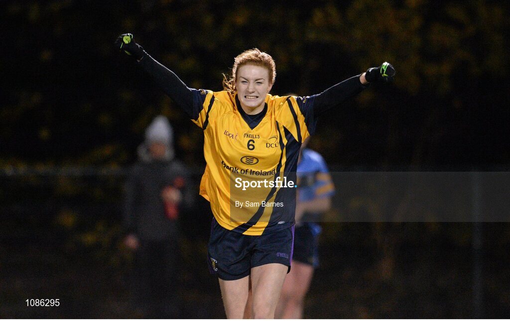3 December 2015; Lauren Magee, DCU, celebrates at the final whistle. Senior Women's Football League Final, UCD vs DCU, Belfield, Dublin. Picture credit: Sam Barnes / SPORTSFILE