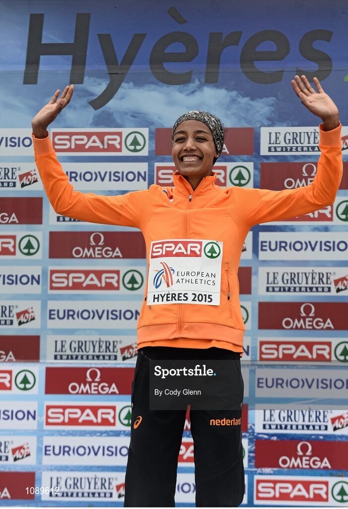 13 December 2015; Sifan Hassan, The Netherlands, on the podium after winning the Senior Women's event. SPAR European Cross Country Championships Hyeres 2015. Paray Le Monial, France Picture credit: Cody Glenn / SPORTSFILE