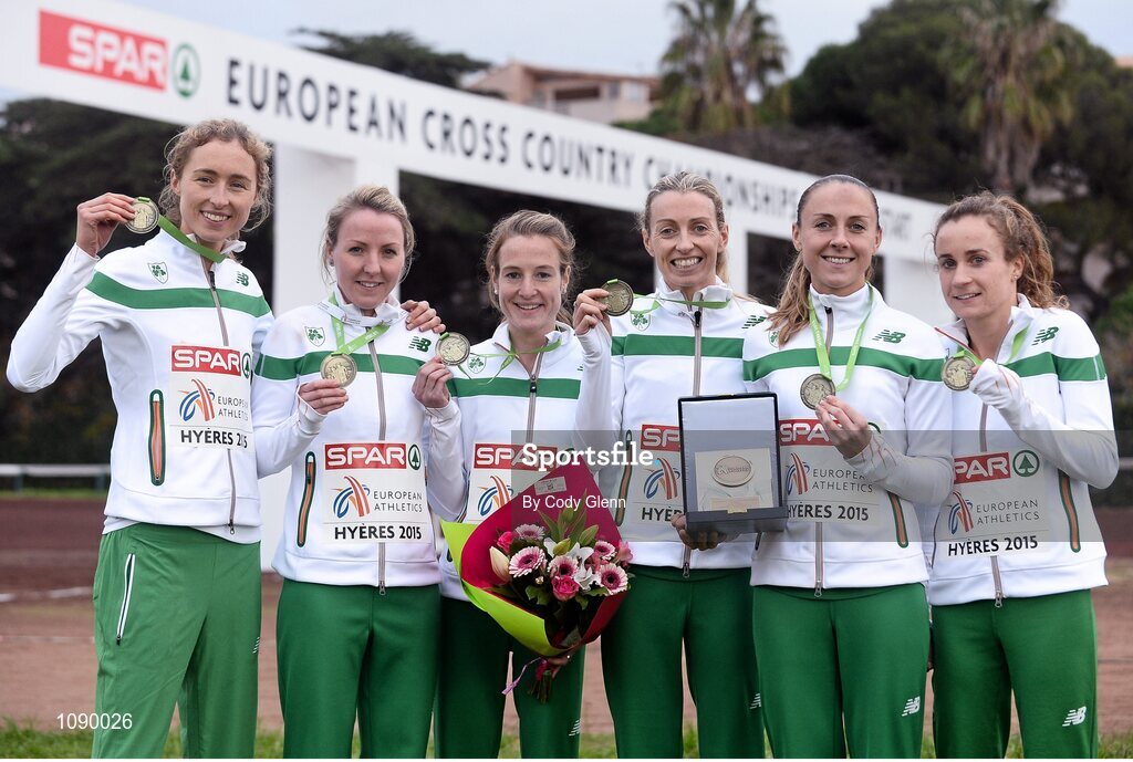 13 December 2015; The bronze medal winning Ireland Senior Women's team, from left, Caroline Crowley, Ciara Durkan, Fionnuala McCormack, Lizzie Lee, Kerry O'Flaherty and Michele Finn. SPAR European Cross Country Championships Hyeres 2015. Paray Le Monial, France Picture credit: Cody Glenn / SPORTSFILE