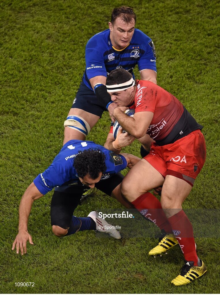 19 December 2015; Guilhem Guirado, Toulon, is tackled by Isa Nacewa and Rhys Ruddock, Leinster. European Rugby Champions Cup, Pool 5, Round 4, Leinster v RC Toulon. Aviva Stadium, Lansdowne Road, Dublin. Photo by Sportsfile
