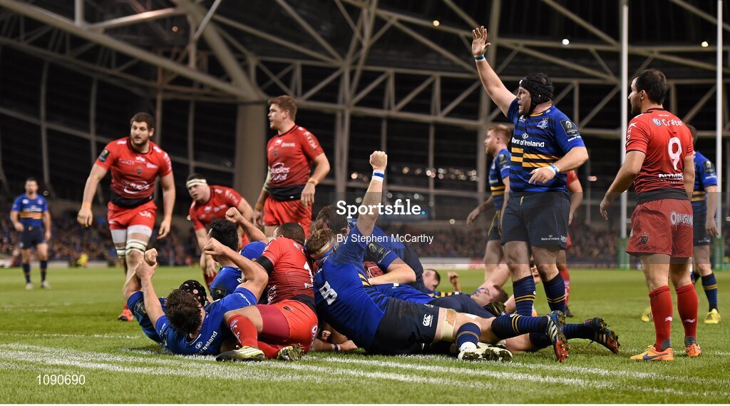 19 December 2015; Leinster players reacts after referee Wayne Barnes awarded them a penalty try. European Rugby Champions Cup, Pool 5, Round 4, Leinster v RC Toulon. Aviva Stadium, Lansdowne Road, Dublin. Picture credit: Stephen McCarthy / SPORTSFILE