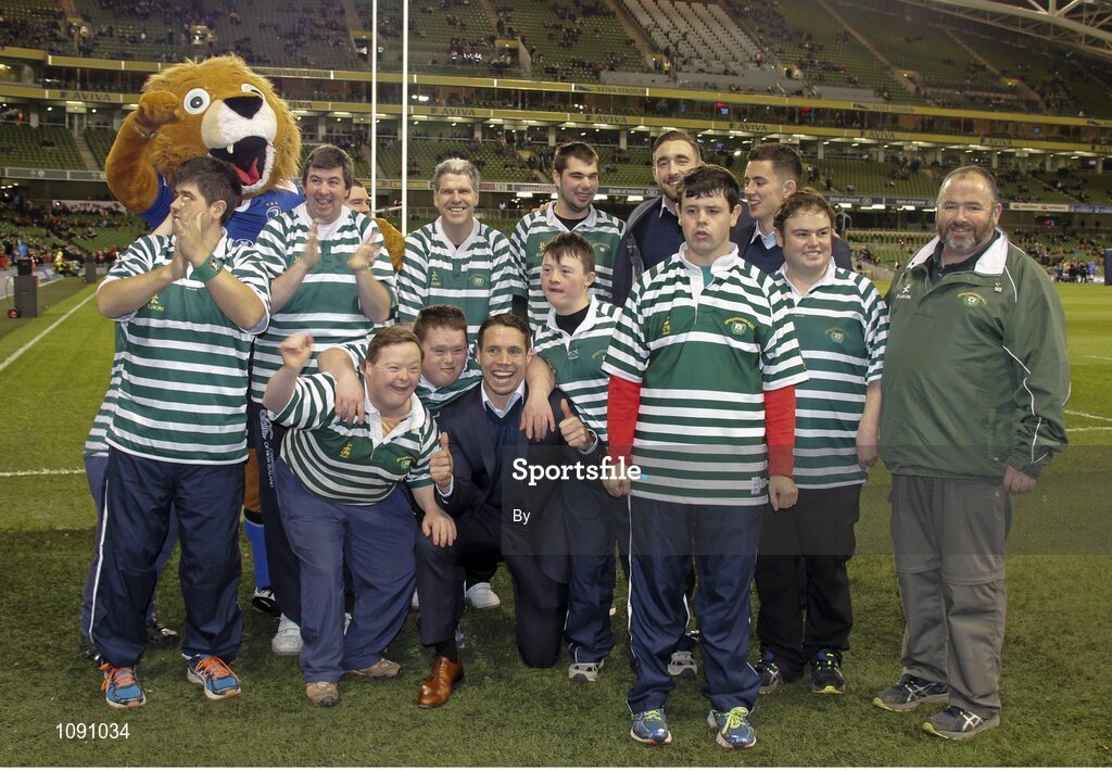 19 December 2015; The Greystones Seagulls team with Leinster's Isaac Boss, Jack Conan and Noel Reid ahead of their Bank of Ireland Half-Time Mini Games at the European Rugby Champions Cup, Pool 5, Round 4, clash between Leinster and RC Toulon at the Aviva Stadium, Lansdowne Road, Dublin. Picture credit: SPORTSFILE