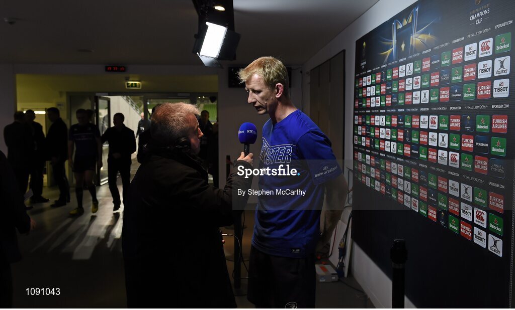 19 December 2015; Leinster head coach Leo Cullen is interviewed by RTE's Michael Corcoran. European Rugby Champions Cup, Pool 5, Round 4, Leinster v RC Toulon. Aviva Stadium, Lansdowne Road, Dublin. Picture credit: Stephen McCarthy / SPORTSFILE