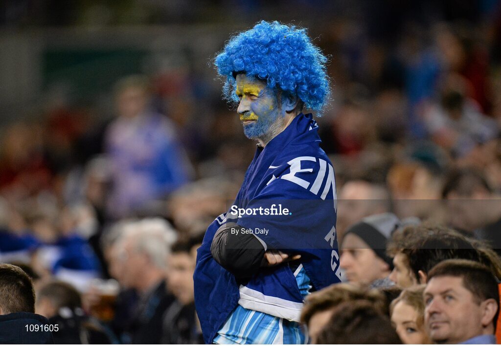 19 December 2015; A Leinster supporter reflects ahead of the start of the match. European Rugby Champions Cup, Pool 5, Round 4, Leinster v RC Toulon. Aviva Stadium, Lansdowne Road, Dublin. Picture credit: Seb Daly / SPORTSFILE