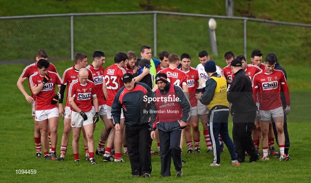 3 January 2016; New Cork manager Peadar Healy, right, and selector Eamonn Ryan leave the pitch with their team after the game. McGrath Cup Football, Group B, Round 1, Cork v Limerick. Mallow GAA Grounds, Mallow, Co. Cork. Picture credit: Brendan Moran / SPORTSFILE
