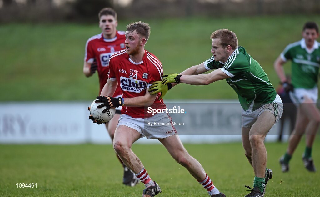 3 January 2016; Killian O'Hanlon, Cork, in action against Sean O'Dea, Limerick. McGrath Cup Football, Group B, Round 1, Cork v Limerick. Mallow GAA Grounds, Mallow, Co. Cork. Picture credit: Brendan Moran / SPORTSFILE