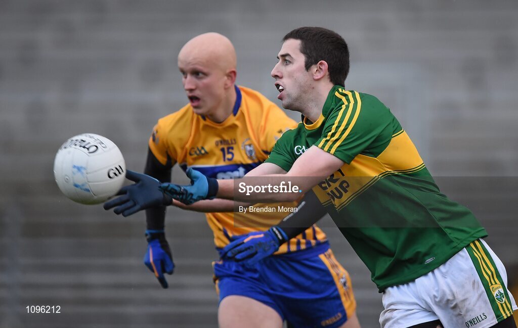 10 January 2016; Ger Hartnett, Kerry, in action against Martin O'Leary, Clare. McGrath Cup, Group A, Round 2, Kerry v Clare, Fitzgerald Stadium, Killarney, Co. Kerry. Picture credit: Brendan Moran / SPORTSFILE