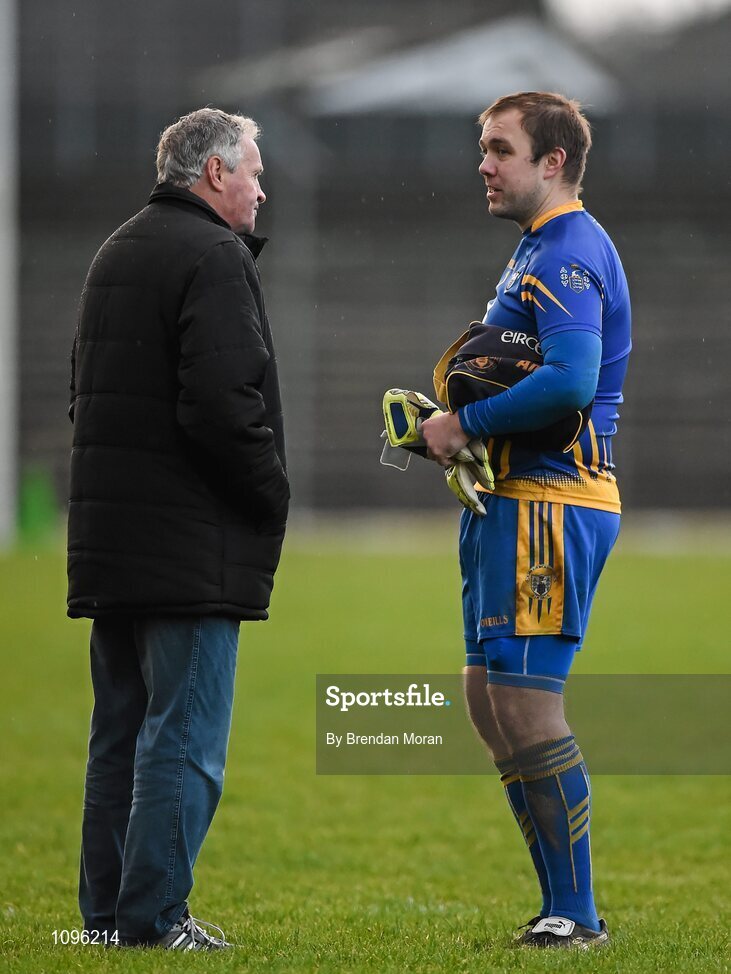 10 January 2016; Clare goalkeeper Joe Hayes in conversation with Kerry selector Mikey Sheehy after the game. McGrath Cup, Group A, Round 2, Kerry v Clare, Fitzgerald Stadium, Killarney, Co. Kerry. Picture credit: Brendan Moran / SPORTSFILE