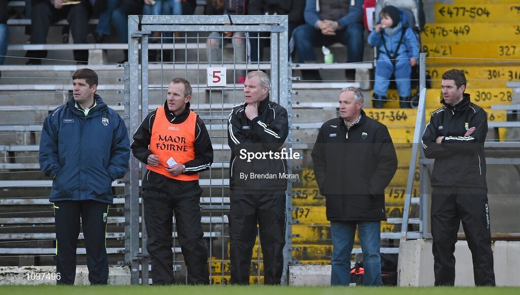 10 January 2016; Kerry manager Eamonn Fitzmaurice, left, with his selectors, from 2nd left, Liam Hassett, Diarmuid Murphy, Mikey Sheehy and trainer Padraig Corcoran. McGrath Cup, Group A, Round 2, Kerry v Clare, Fitzgerald Stadium, Killarney, Co. Kerry. Picture credit: Brendan Moran / SPORTSFILE