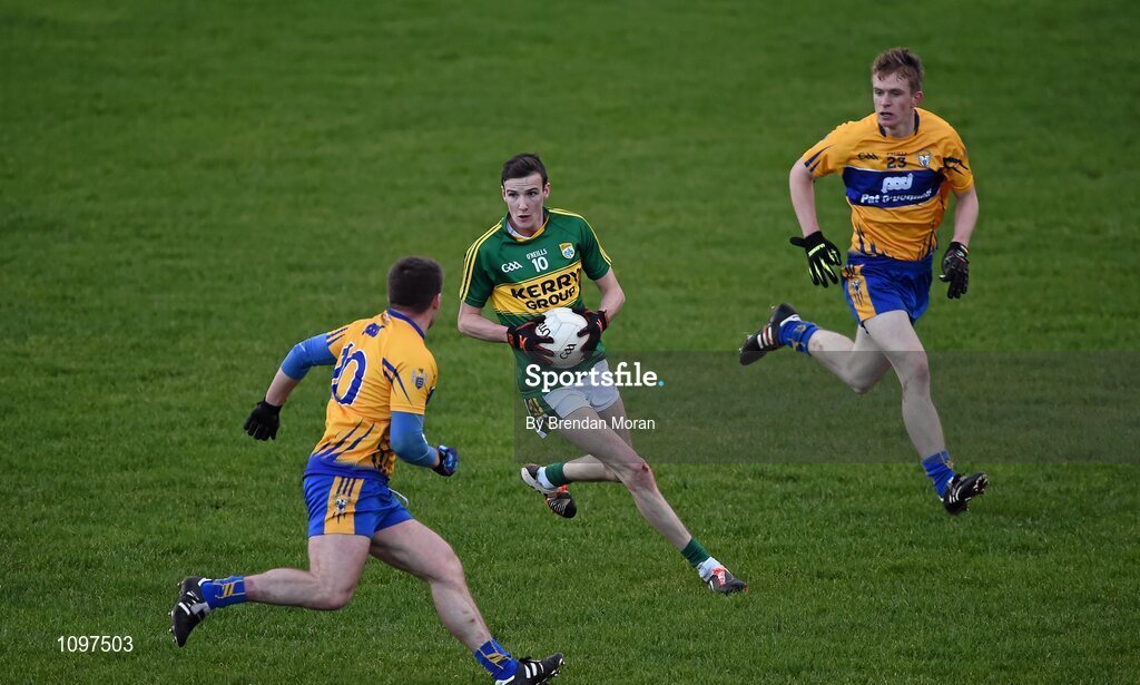 10 January 2016; Philip O'Connor, Kerry, in action against Sean Collins, left, and Conor O'Halloran, Clare. McGrath Cup, Group A, Round 2, Kerry v Clare, Fitzgerald Stadium, Killarney, Co. Kerry. Picture credit: Brendan Moran / SPORTSFILE
