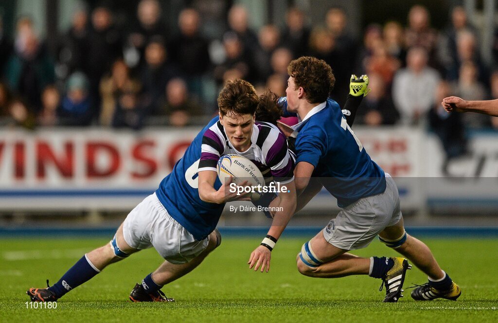 24 January 2016; Sam Dardis, Terenure College, is tackled by Andrew McDermott, left, and Faolán Crowe, St Mary's College. Bank of Ireland Leinster Schools Senior Cup, 1st Round, St Mary's College v Terenure College, Donnybrook Stadium, Donnybrook, Dublin. Picture credit: Dáire Brennan / SPORTSFILE