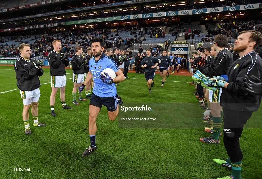 30 January 2016; Dublin's Cian O'SullEvan runs out as the Kerry players form a guard of honour for the 2015 GAA Football All-Ireland Champions. Allianz Football League, Division 1, Round 1, Dublin v Kerry, Croke Park, Dublin. Picture credit: Stephen McCarthy / SPORTSFILE