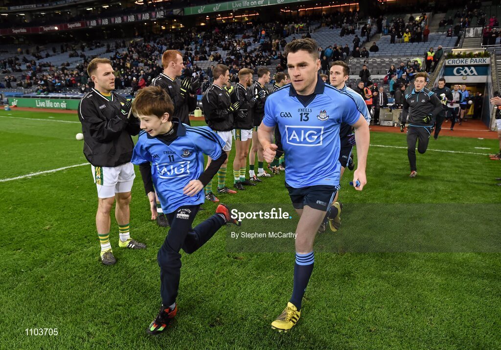 30 January 2016; Paddy Andrews, Dublin, runs out as the Kerry players form a guard of honour for the 2015 GAA Football All-Ireland Champions.Allianz Football League, Division 1, Round 1, Dublin v Kerry, Croke Park, Dublin. Picture credit: Stephen McCarthy / SPORTSFILE