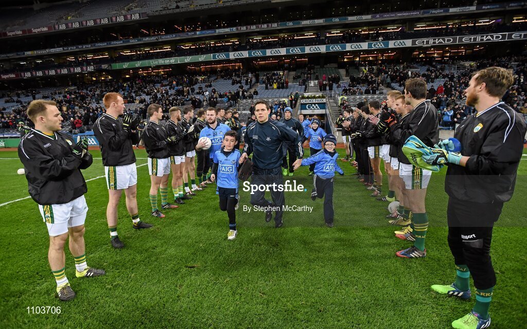 30 January 2016; Dublin captain Stephen Cluxton leads his side out as the Kerry players form a guard of honour for the 2015 GAA Football All-Ireland Champions. Allianz Football League, Division 1, Round 1, Dublin v Kerry, Croke Park, Dublin. Picture credit: Stephen McCarthy / SPORTSFILE